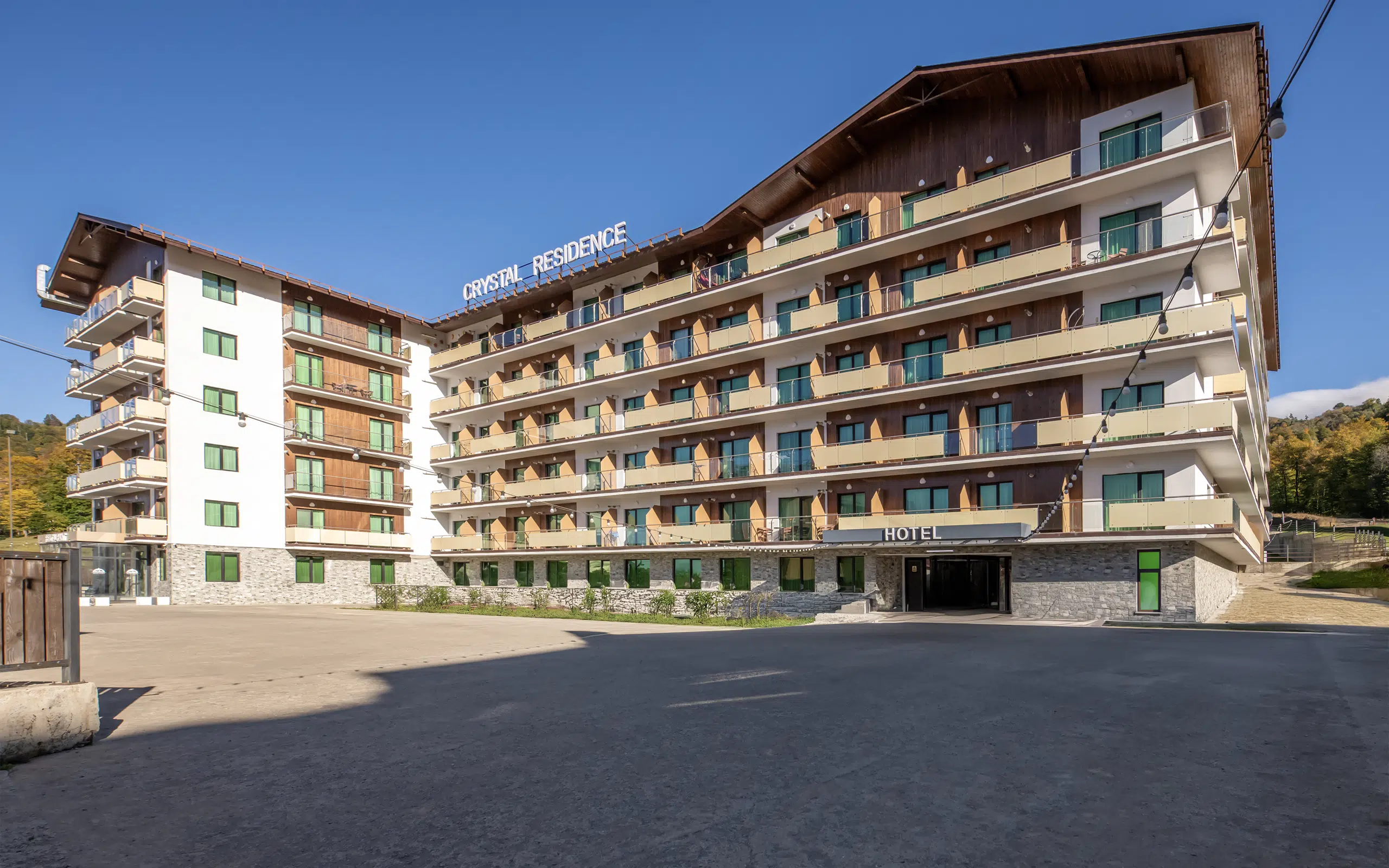 A hotel-residential complex located in the Crystal resort area, next to the forest park. Guests can enjoy access to a swimming pool, Finnish sauna, spa and fitness services, as well as a supermarket. Several café-restaurants are just a few meters from the building, and a lobby bar is located on the first floor of the complex.